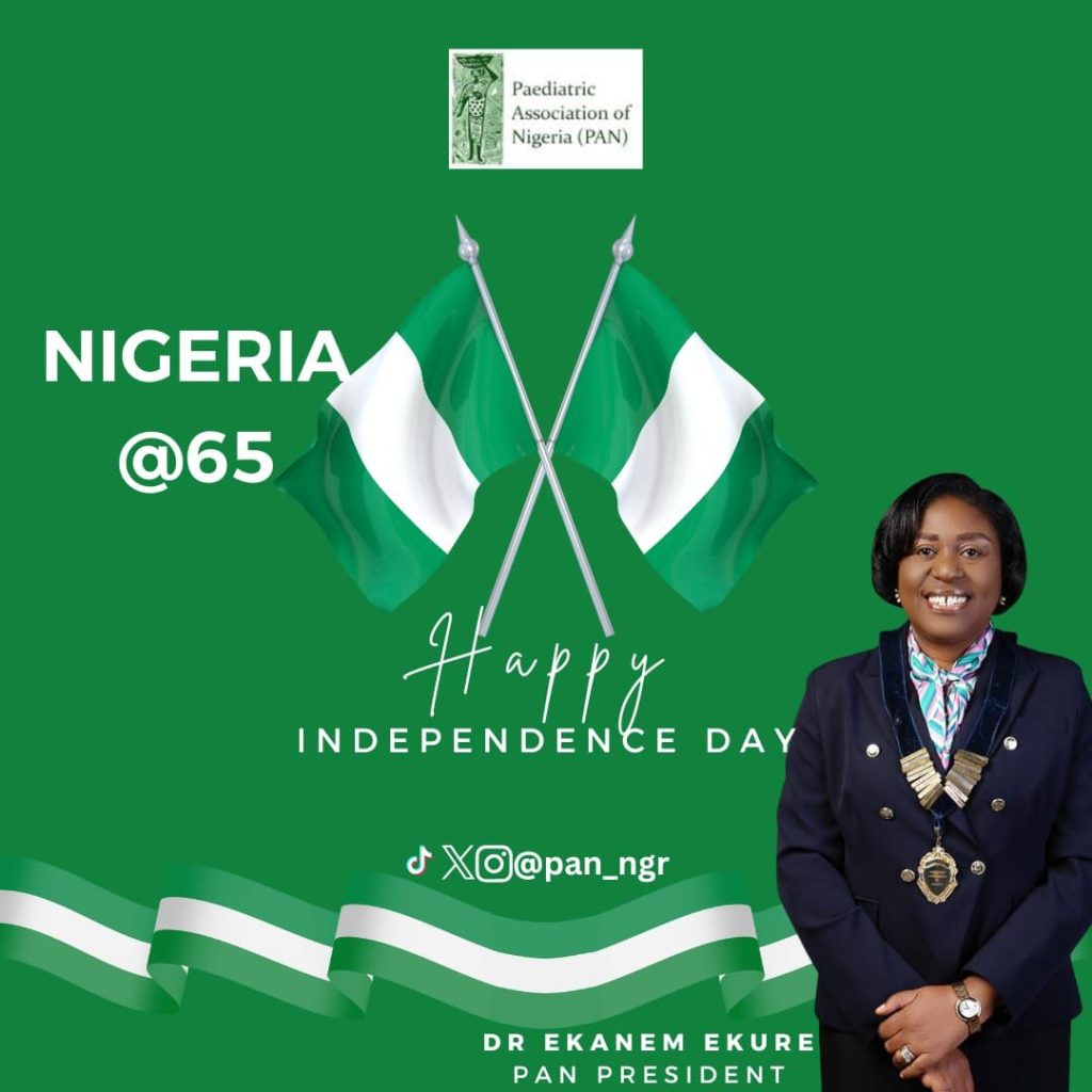 The Paediatric Association of Nigeria (PAN) celebrates with our dear nation Nigeria at Sixty-five.  We thank God for keeping us as a nation despite daunting challenges. In the spirit of this celebration, we also honor the Nigerian child — the heartbeat of our nation and the promise of tomorrow. Every Nigerian child carries within them the dreams of a greater Nigeria, and it is our collective responsibility to nurture, protect, and empower them to reach their fullest potential.